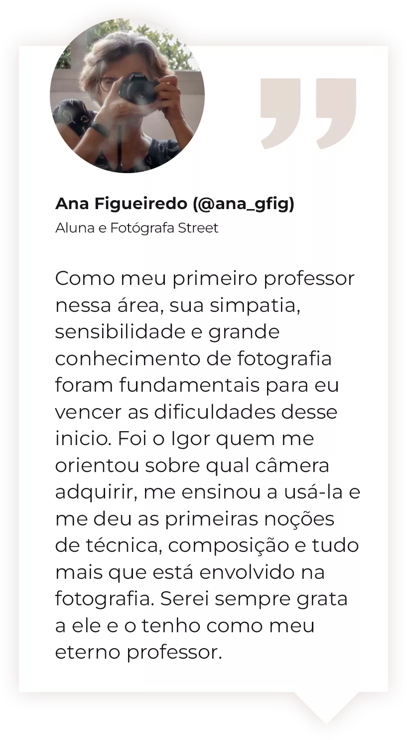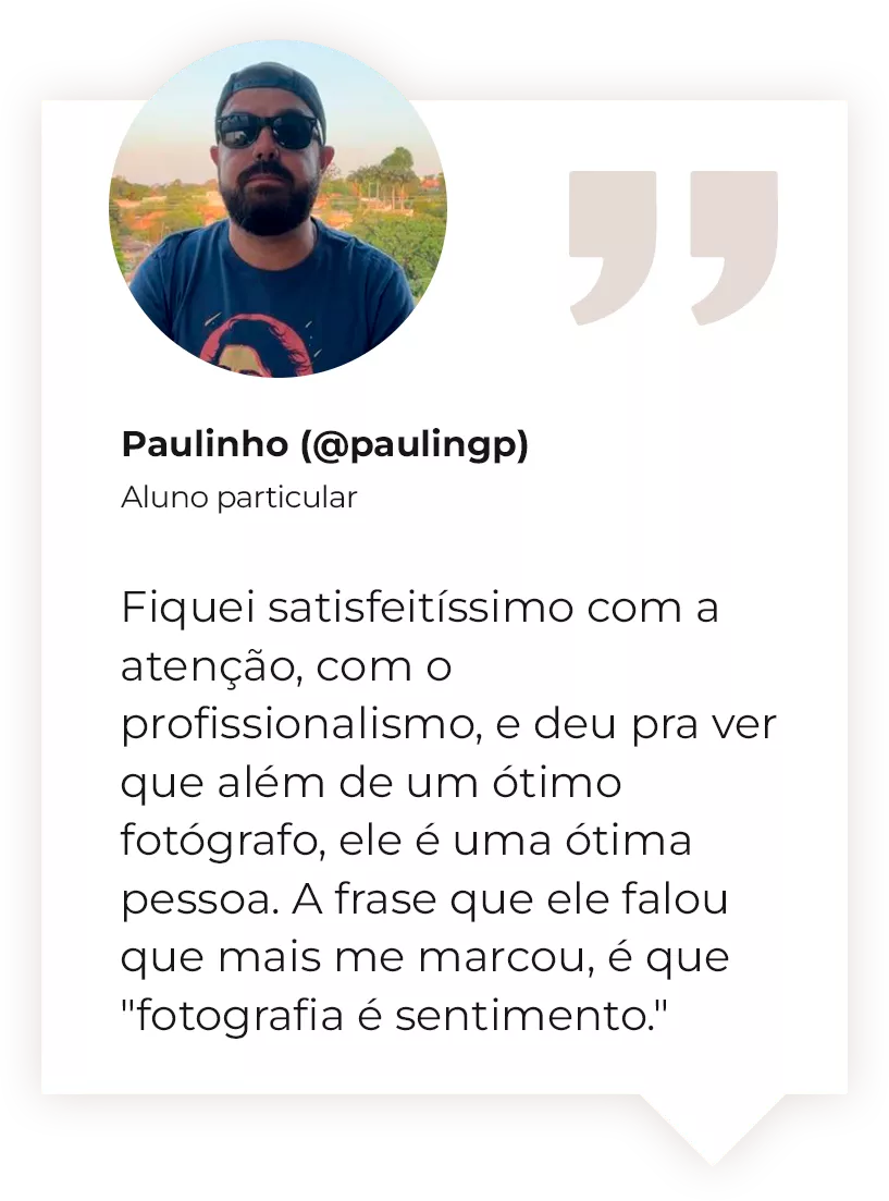 Meu objetivo é tornar fotógrafos apaixonados em fotógrafos profissionais. Independente da sua ambição, ou condição monetária. Faço isso ajudando as pessoas a transportarem sua alma e seu propósito para a fotografia, de forma leve, descontraída - quem me conhece já sabe muito bem - e muito didática!